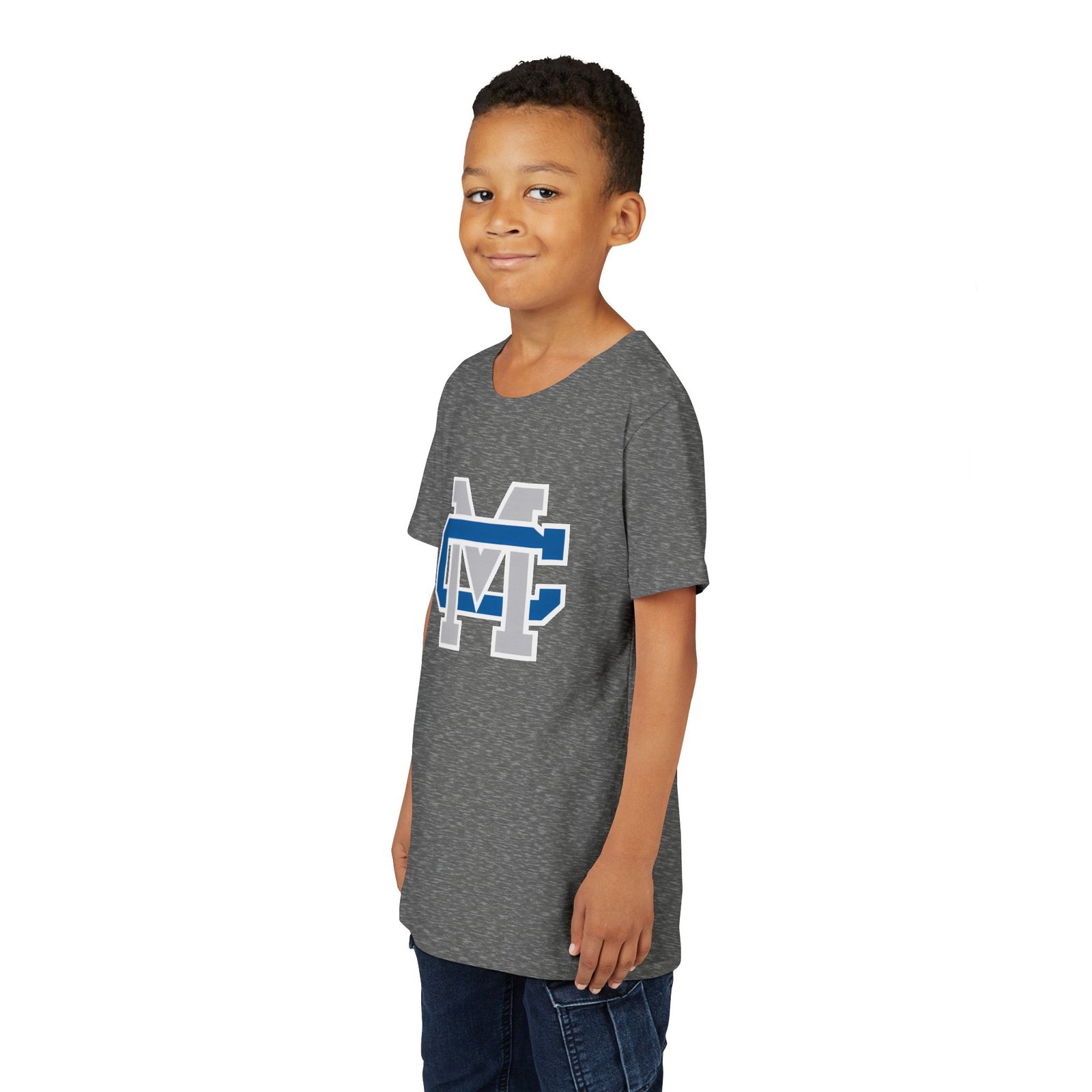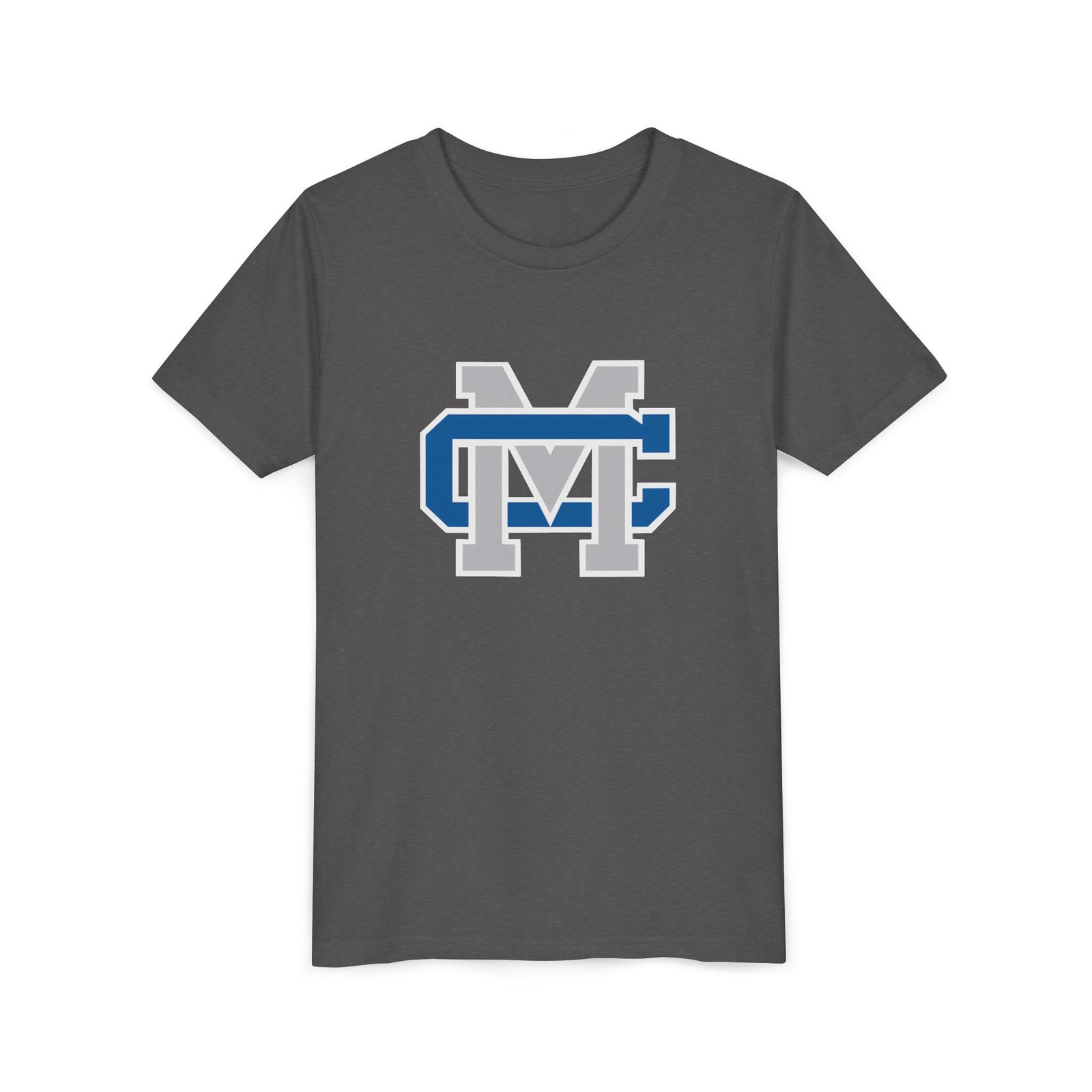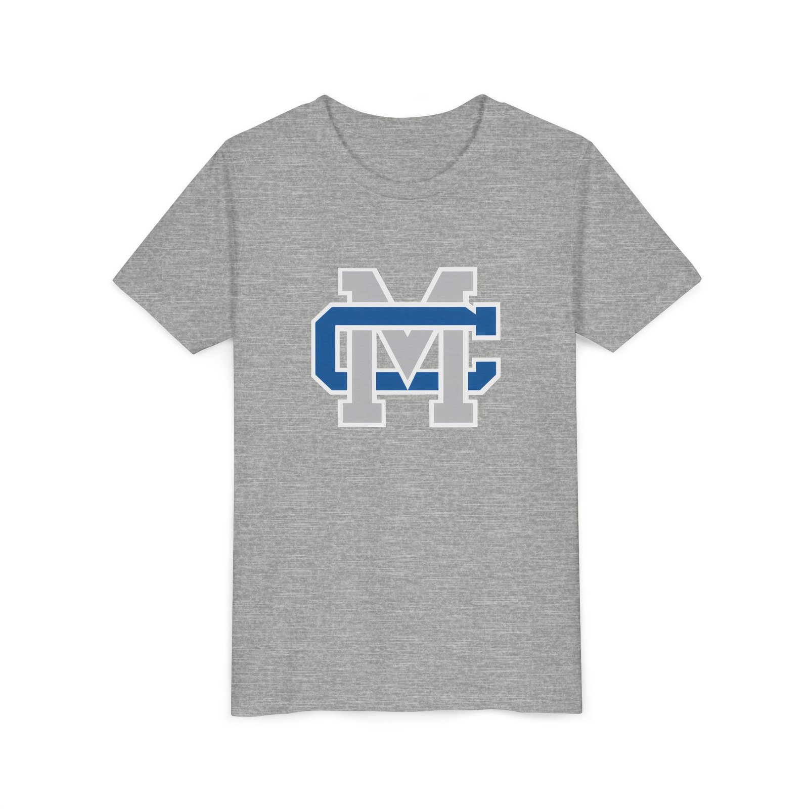 This lightweight youth tee carries a bold collegiate-inspired emblem that feels instantly familiar — the layered ‘M’ and ‘C’ lock together in crisp blue, white, and gray. Soft, airlume-combed ring-spun cotton gives it a gentle, broken-in feel that moves with a kid’s day: classroom, practice, playground. The retail cut and crew neckline keep the silhouette clean and easy to layer under jackets or over long sleeves. Thoughtful construction details — side seams, shoulder tape, ribbed collar and a tear-away DTF neck label — mean the shirt keeps its shape and stays comfortable wash after wash. Ethically made blanks from Bella+Canvas add a quieter confidence: quality you can feel, responsibly produced.
