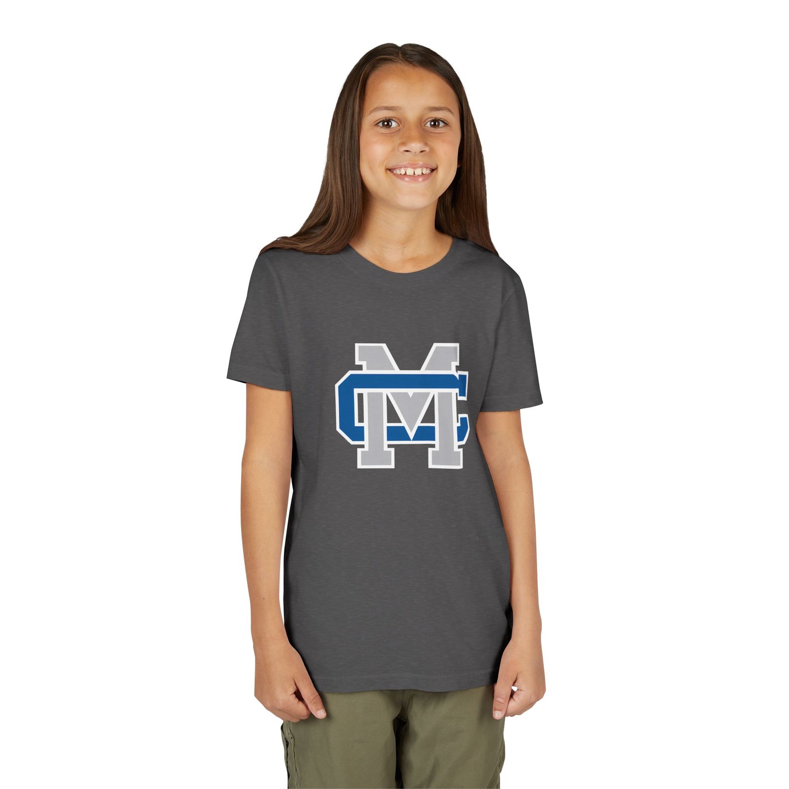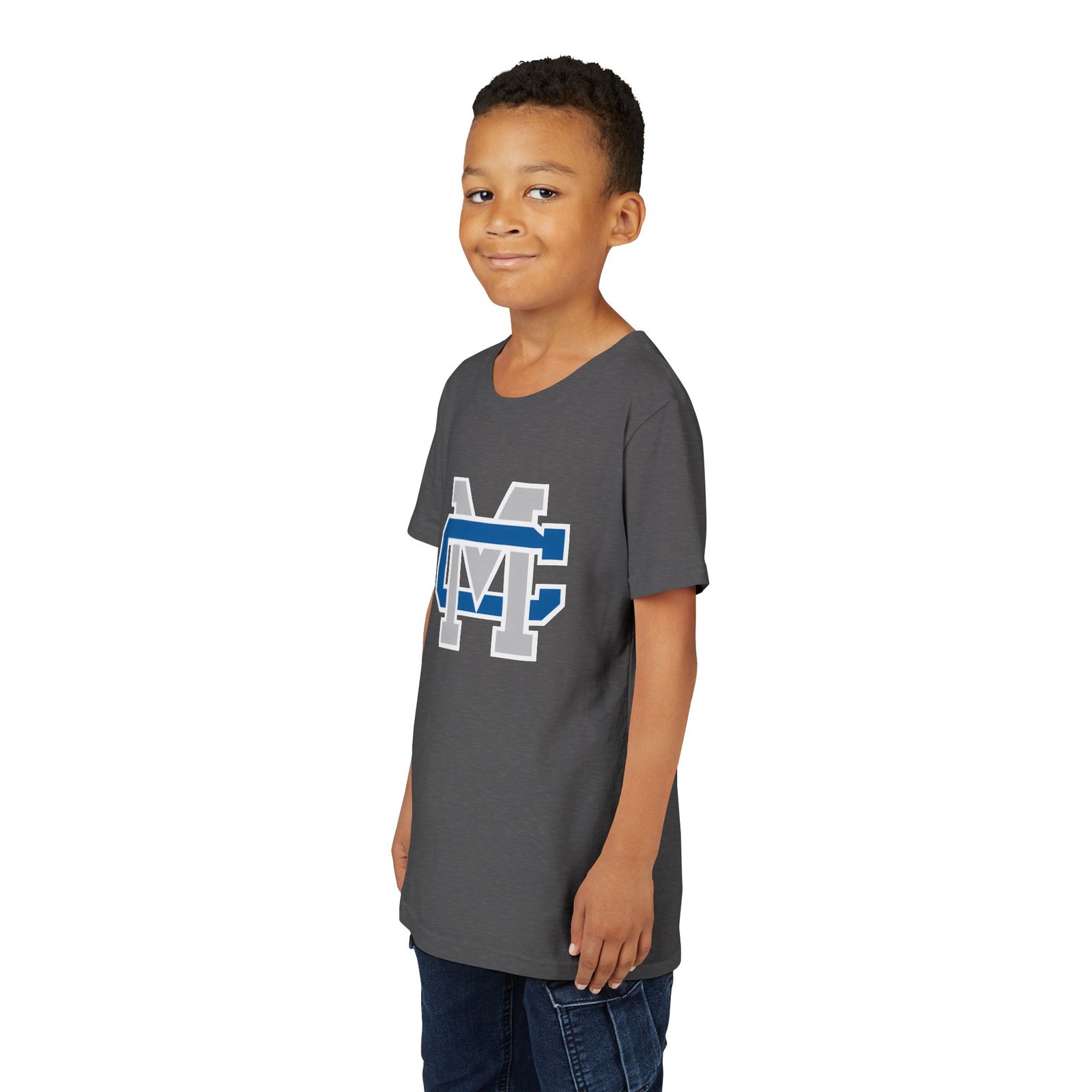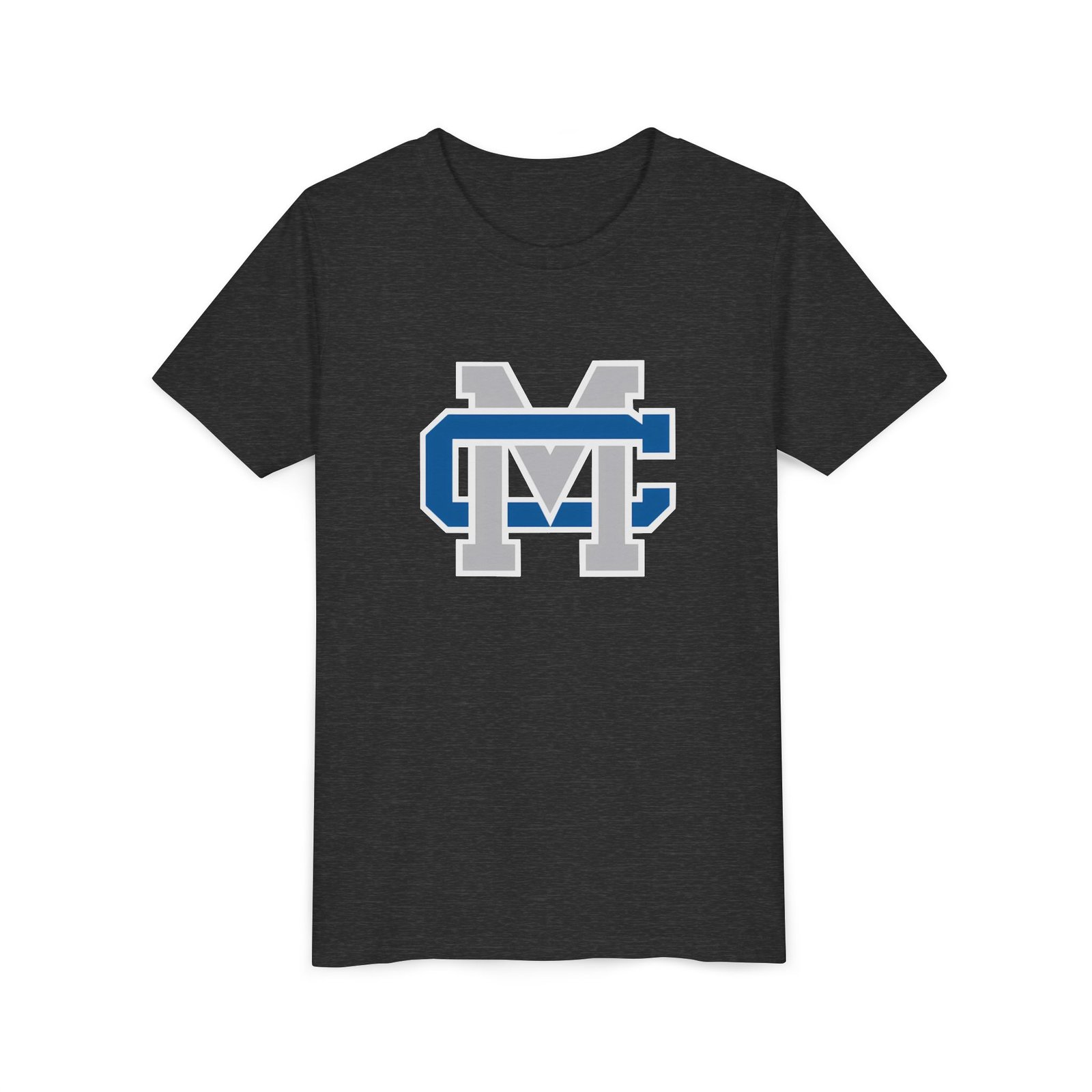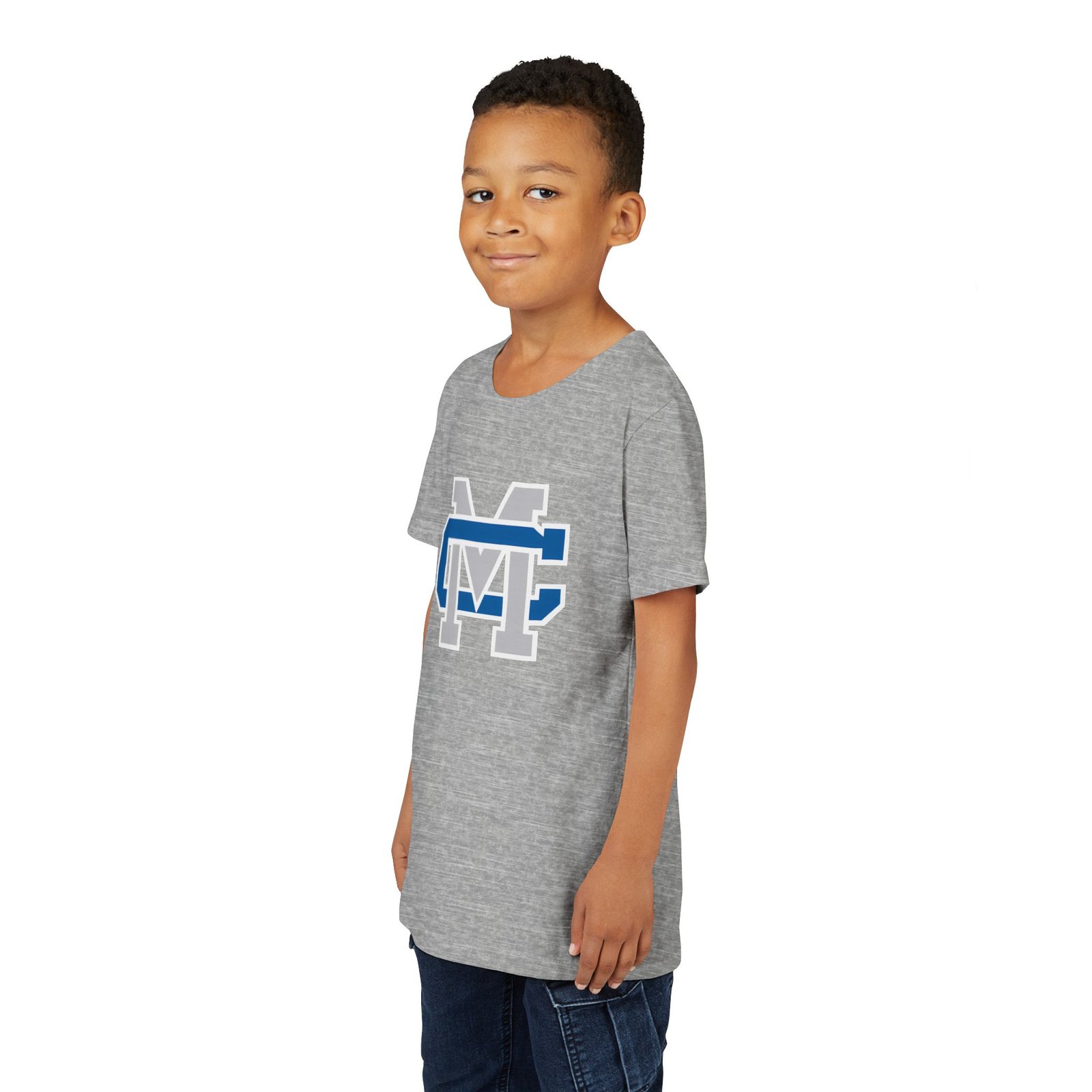 This lightweight youth tee carries a bold collegiate-inspired emblem that feels instantly familiar — the layered ‘M’ and ‘C’ lock together in crisp blue, white, and gray. Soft, airlume-combed ring-spun cotton gives it a gentle, broken-in feel that moves with a kid’s day: classroom, practice, playground. The retail cut and crew neckline keep the silhouette clean and easy to layer under jackets or over long sleeves. Thoughtful construction details — side seams, shoulder tape, ribbed collar and a tear-away DTF neck label — mean the shirt keeps its shape and stays comfortable wash after wash. Ethically made blanks from Bella+Canvas add a quieter confidence: quality you can feel, responsibly produced.